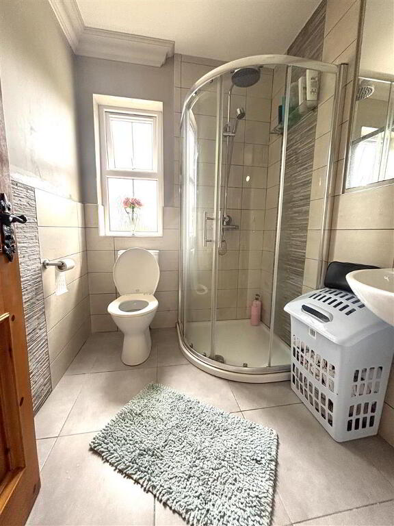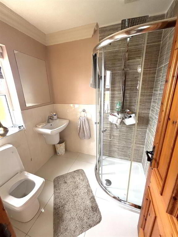 Fully tiled shower cubicle with thermostatic shower. Wall mounted wash hand basin. Extractor fan. Tiled flooring. Part tiled walls. Coving around ceiling.
