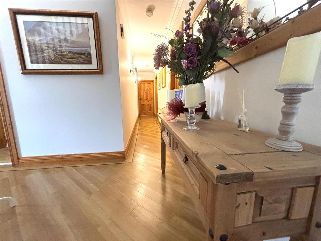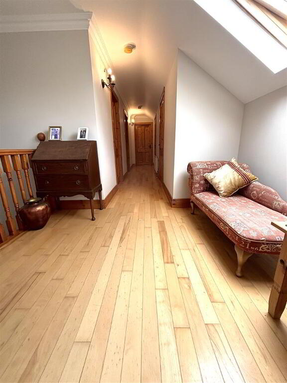 L-shaped hallway with Antico flooring. Coving around ceiling. Telephone point.