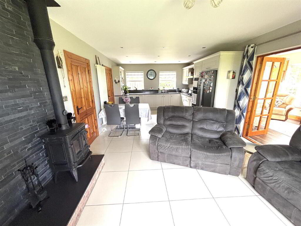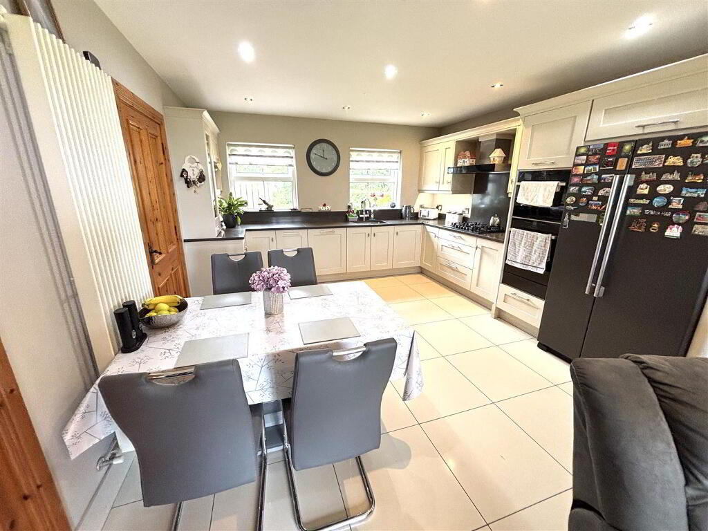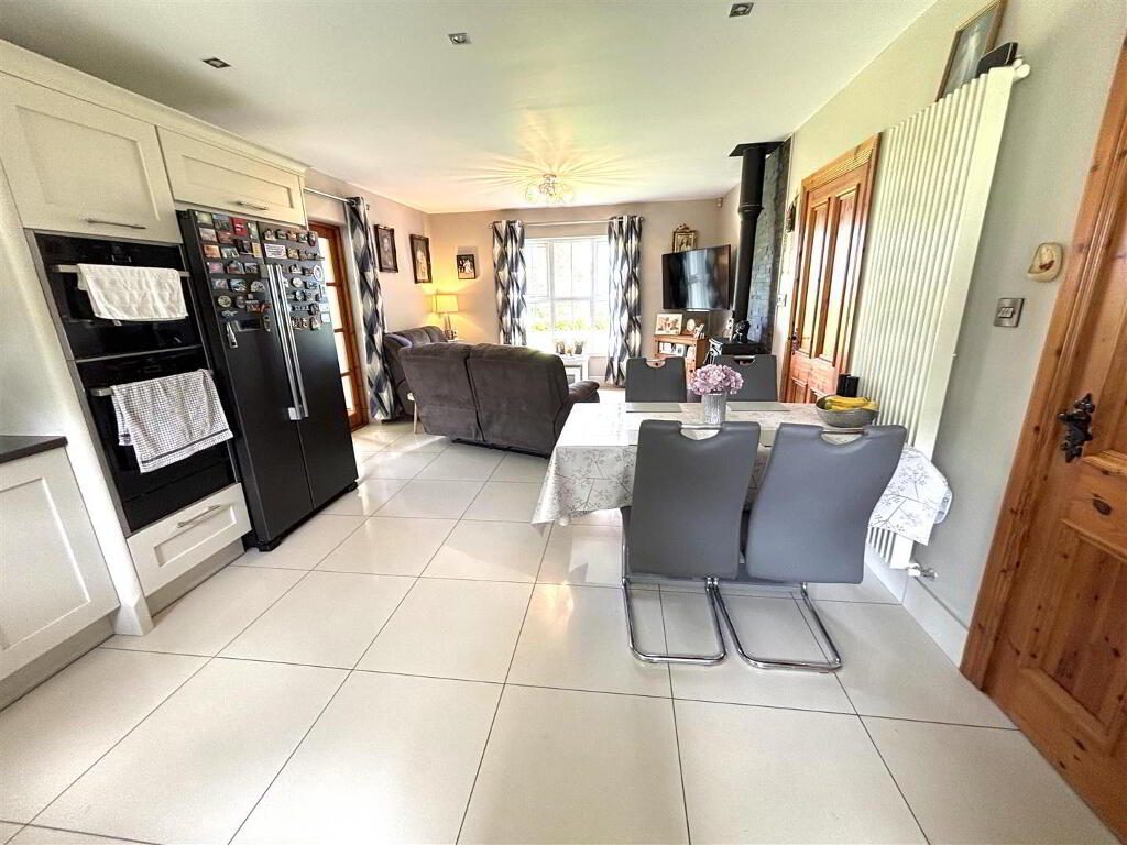 With a range of fitted eye and low level units with matching worktop. Under unit lighting. Sink unit. Instant hot water tap. Large gas countertop hob. Double built in oven. Extractor fan and light. Plumbed for dishwasher. Glass display unit. Tiled flooring. Large multi fuel stove with decorative stone backing.