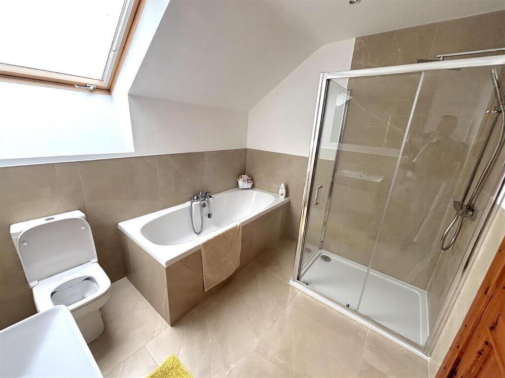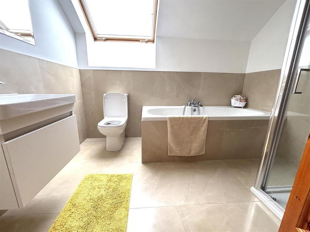 Fully tiled shower cubicle with thermostatic shower. Fitted white bath. Low Flush W.C. Wall mounted wash hand basin with vanity unit underneath. Chrome heated towel rail. Part tiled walls. Extractor fan.