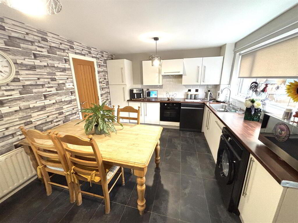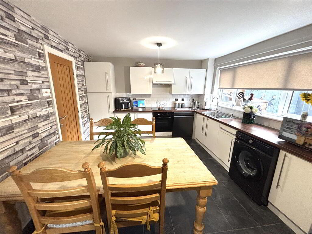 Fitted with a range of eye and low level units with matching worktop. Tiled around units. Stainless steel sink unit. Built in hob and oven. Extractor fan and light. Plumbed for automatic washing machine. Cushion flooring. Under stair storage.