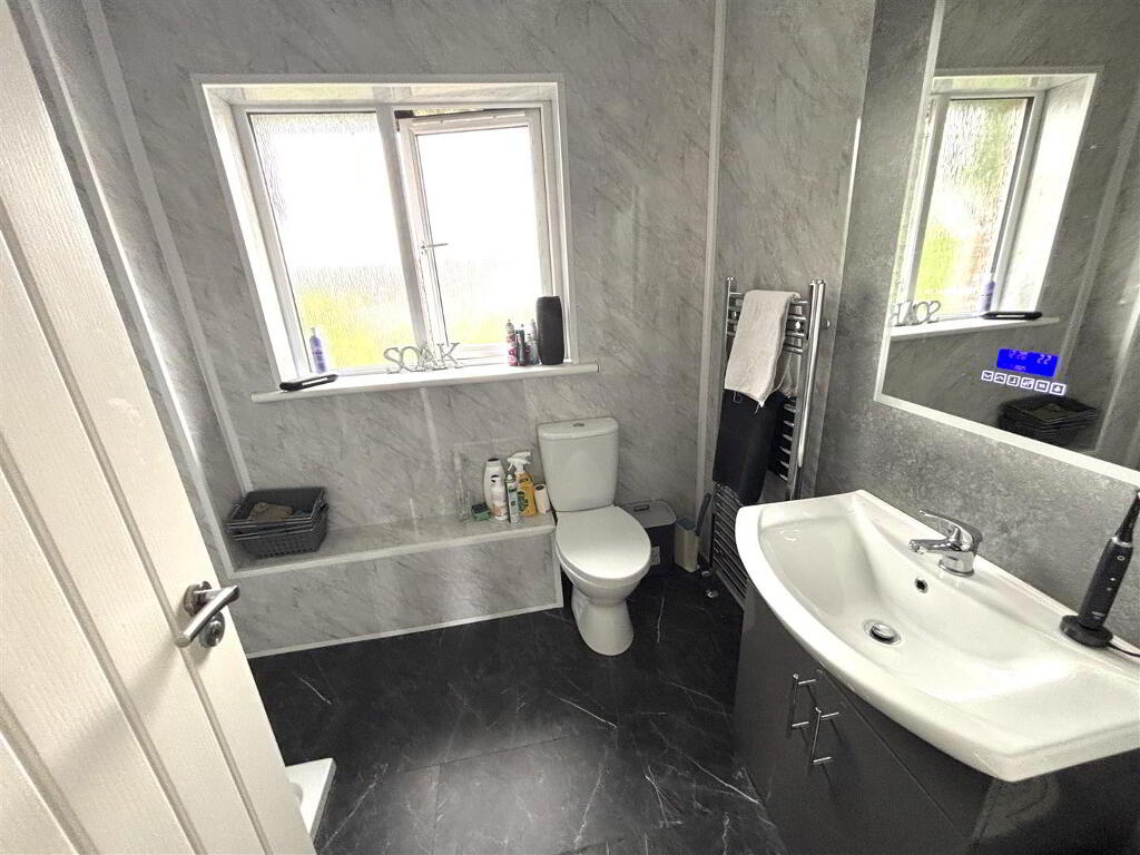 Fully enclosed shower cubicle with electric shower. Wall mounted wash hand basin. Low Flush W.C. Extractor fan. Cushion flooring. Chrome heated towel rail.