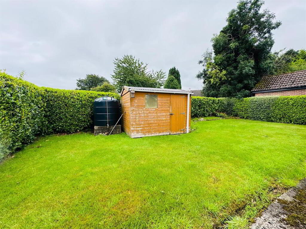 Neat lawn to front. Neat lawn to rear bordered by mature hedge. Garden shed. Driveway.