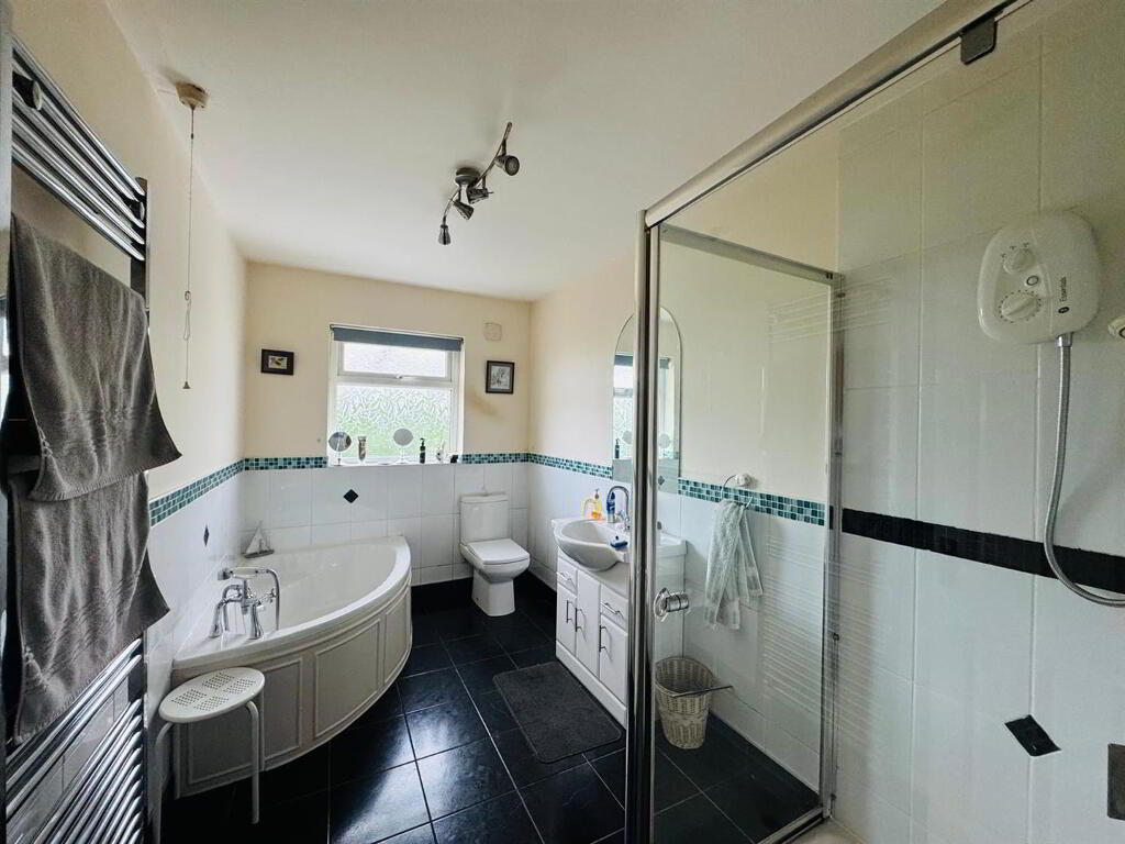 Comprising corner bath with shower attachment to taps, walk in electric shower, whb set in vanity unit, wc, chrome radiator, 1/2 tiled walls, tiled floor.