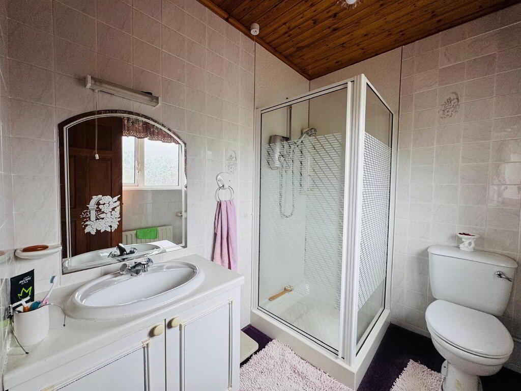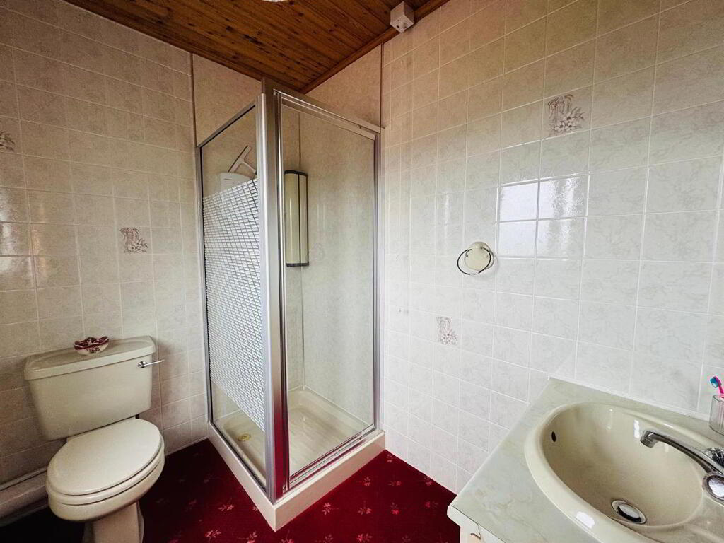 Comprising walk in shower with PVC cladding to walls, whb set in vanity unit, wc, wooden ceiling, tiled walls.