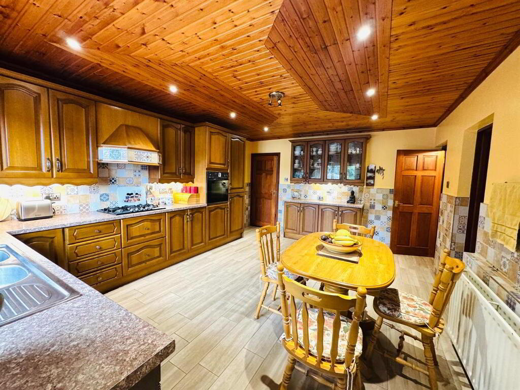 Having eye and low level units, tiling between units, matching pelmet over window, double bowl stainless steel sink unit with mixer taps, gas hob, electric underoven, extractor hood, integrated fridge/freezer and dishwasher, dining space, tiled floor.