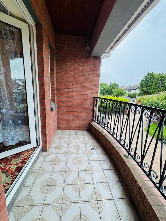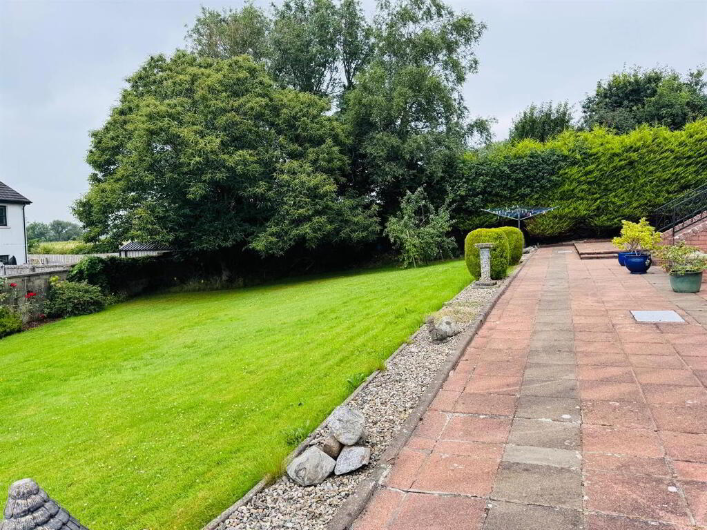 Neat lawn to front bordered by wall, wrought iron fence and double entrance gates. Steps leading to extensive patio area and rear lawn stocked with abundance of plants and shrubs. Paved driveway. Tarmac driveway.
