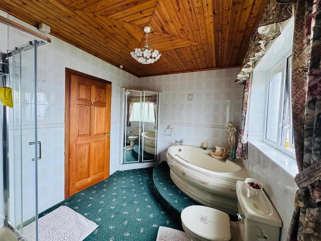 Comprising corner bath, whb and wc, bidet, walk in shower, wooden ceiling, tiled walls.