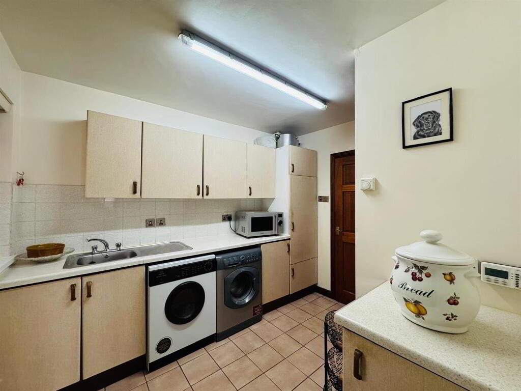 Having eye and low level units, tiling between units, single drainer stainless steel sink unit with mixer taps, plumbed for washing machine, space for tumble dryer, double cloaks cupboard, tiled floor.