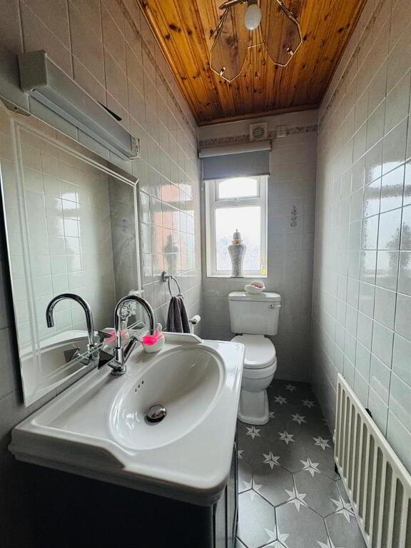 Comprising walk in shower with PVC cladding to walls, whb set in vanity unit, wc, remaining walls tiled.