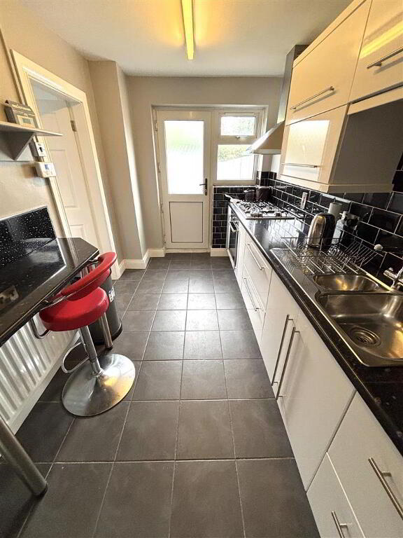 with a range of fitted modern high gloss eye and low level units, matching worktop, tiled around units, under-unit lighting, Stainless steel sink unit, gas hob and electric oven, stainless steel extractor fan with light, breakfast bar, tiled flooring.