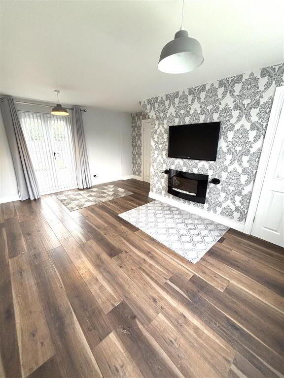 (dual aspect lounge) with electric fire, wood effect laminate flooring, telephone point, UPVC patio doors to raised decked area in rear garden.
