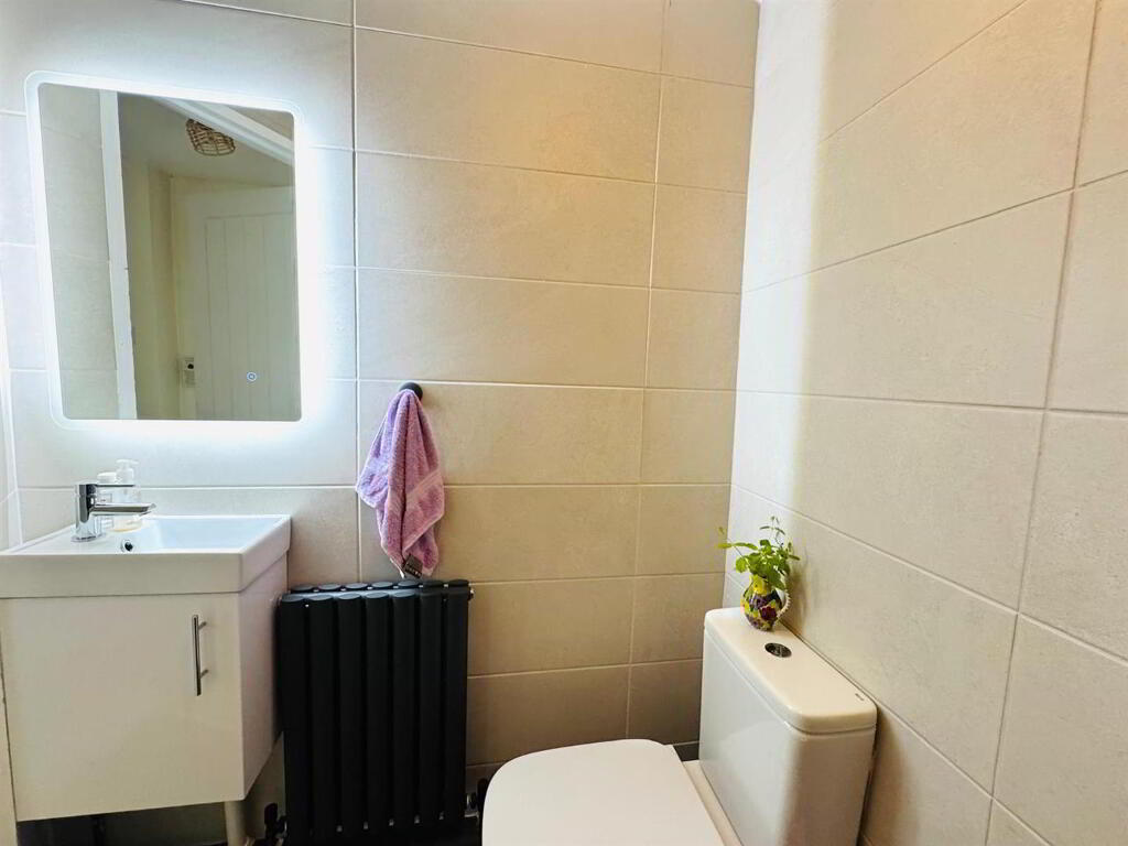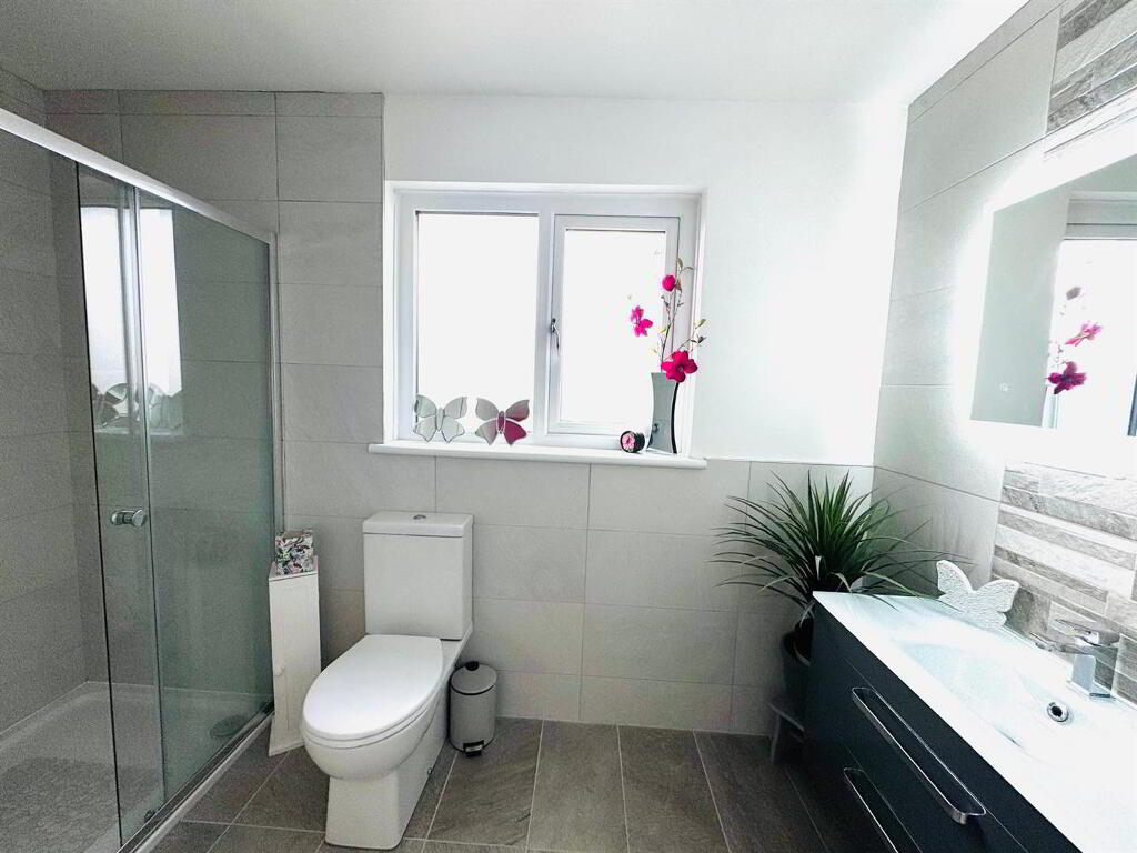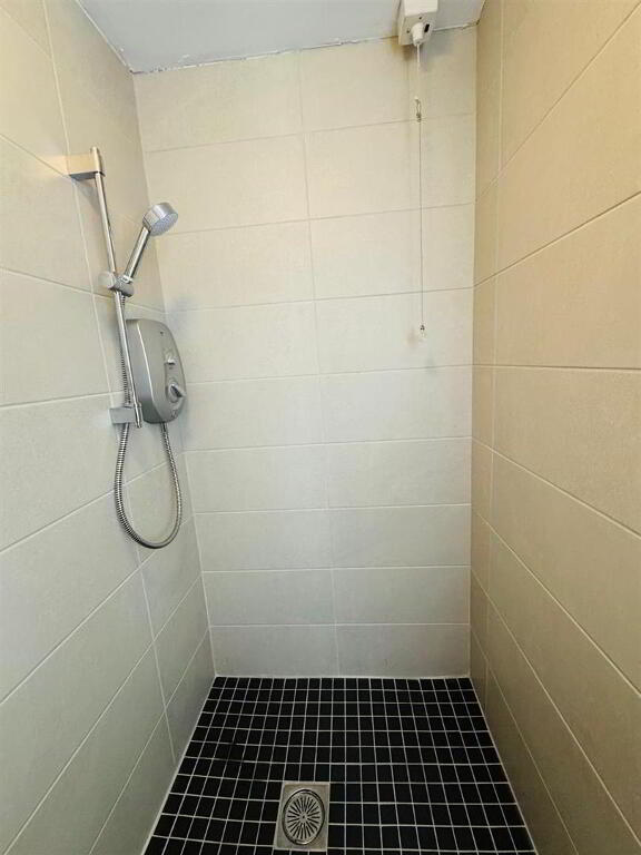 Comprising electric shower, whb set in vanity unit, wc, Bluetooth mirror, fully tiled walls and floor.