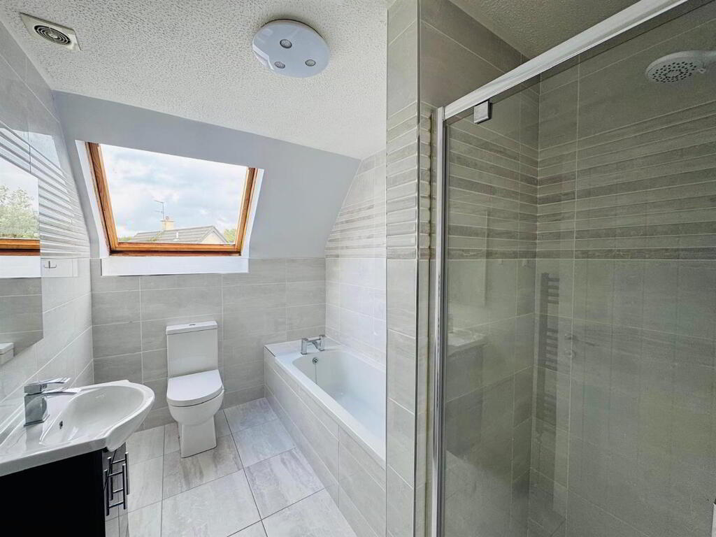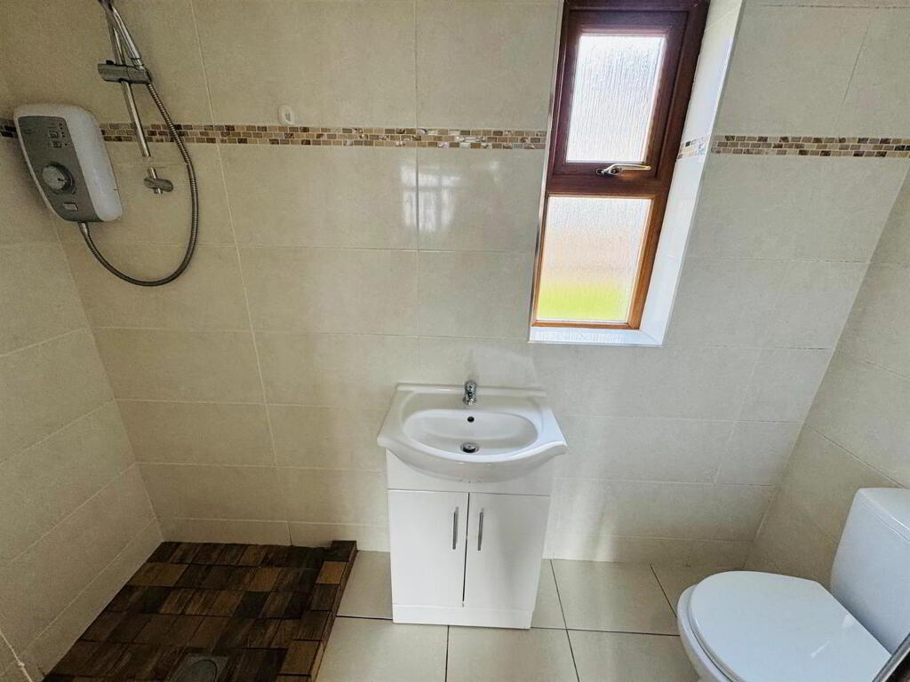 Comprising tiled electric shower, whb set in vanity unit, wc, chrome radiator, fully tiled walls and floor.
