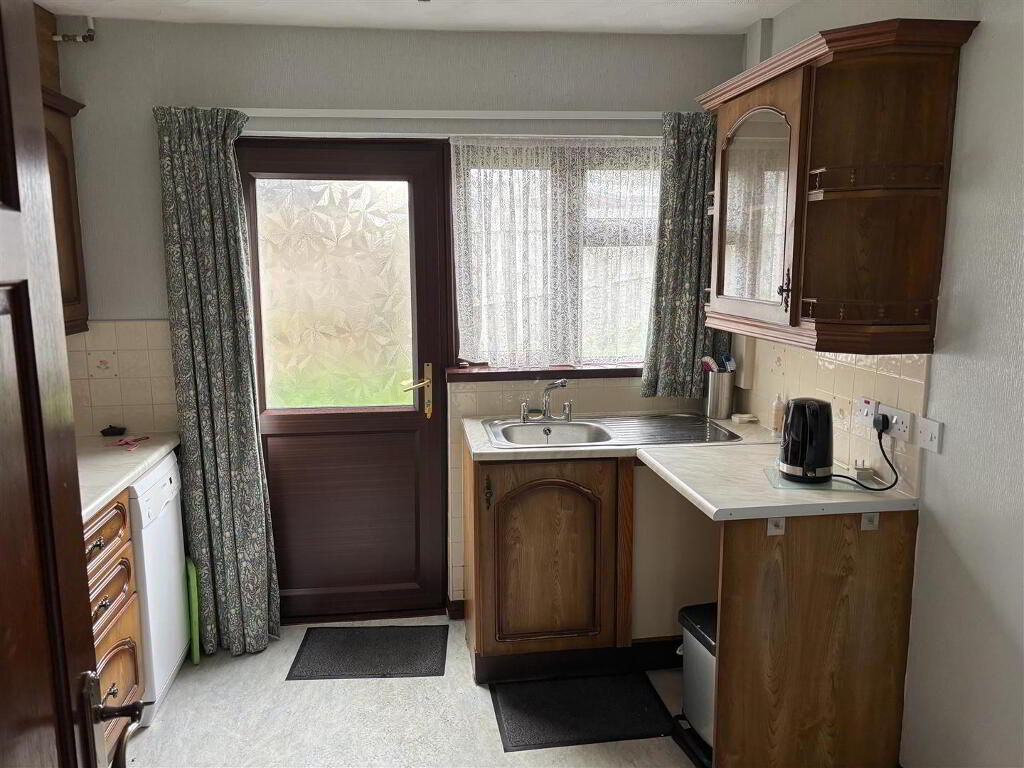 with eye and low level units, matching worktop, tiled around units, stainless steel sink unit, built-in hob and oven, extractor fan with light, glass display unit, space for fridge/freezer, plumbed for automatic washing machine and dishwasher, strip lighting, cushion flooring.
