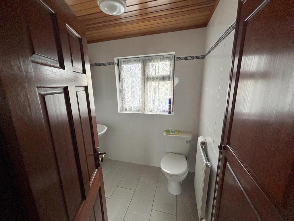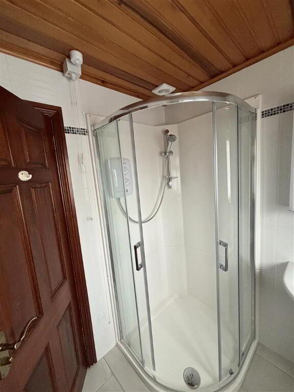 with three piece suite comprising of UPVC shower cubicle with electric shower, pedestal wash hand basin, low flush w.c. Also having extractor fan, hot-press, fully tiled walls, wood panelled ceiling, tiled flooring.