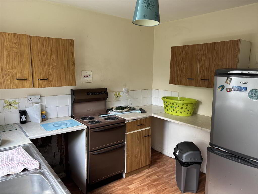Fitted with a range of eye and low level units with matching worktop. Tiled around units. Stainless steel sink unit. Point for hob and oven. Cushion flooring.