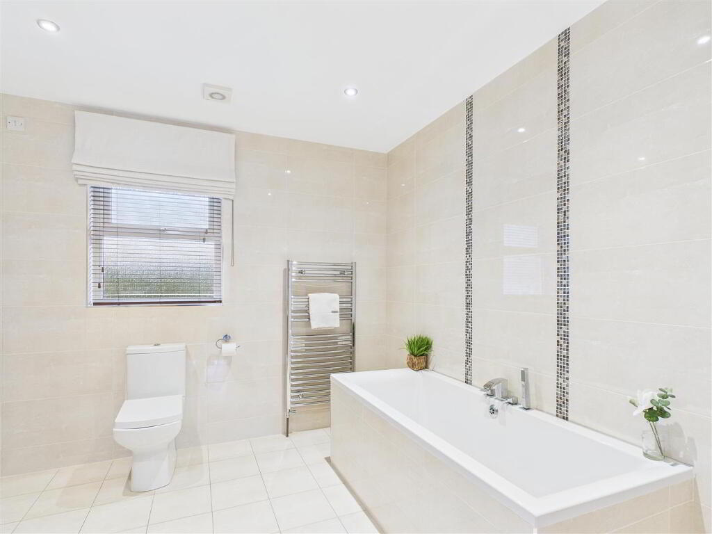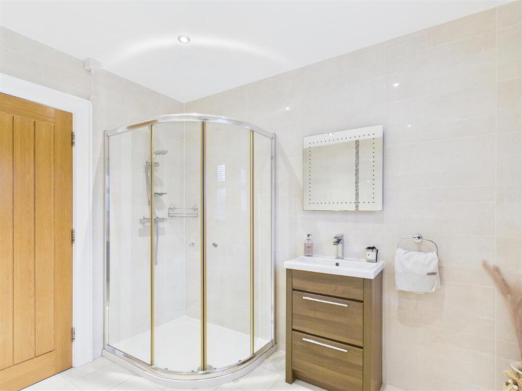 with four piece suite comprising of fitted bath, wash hand basin with low level vanity unit, low flush w.c., fully tiled corner shower cubicle with Thermostat shower. Also having extractor fan, Chrome heated towel rail, recessed low voltage down-lighters, fully tiled walls, tiled flooring.