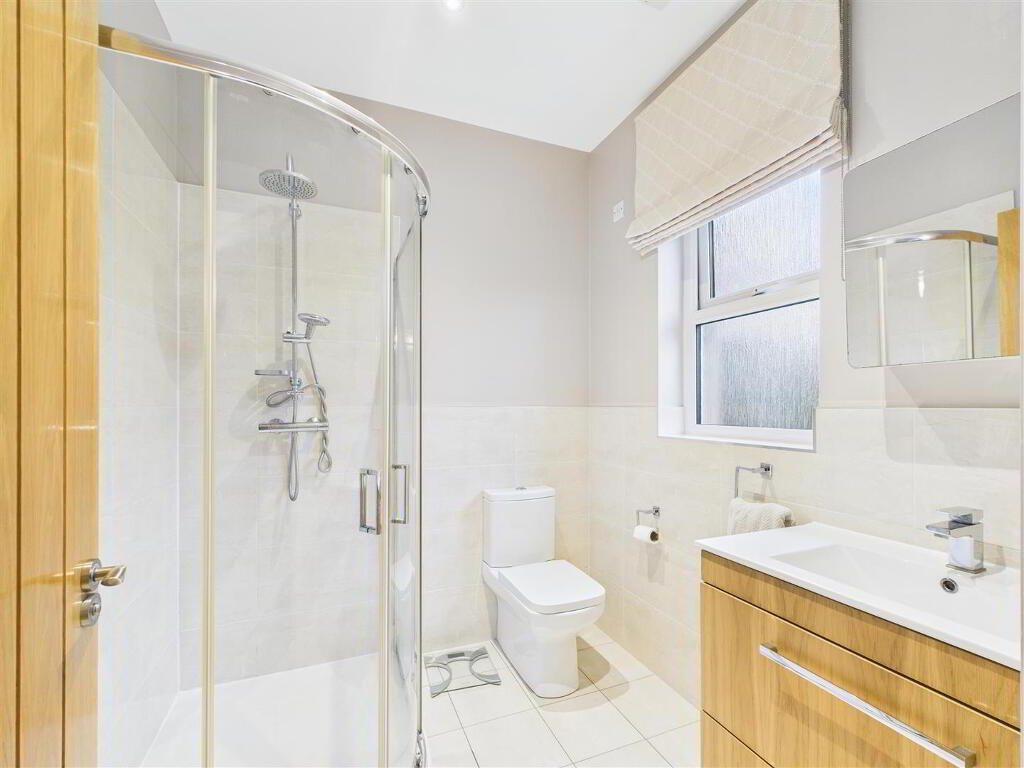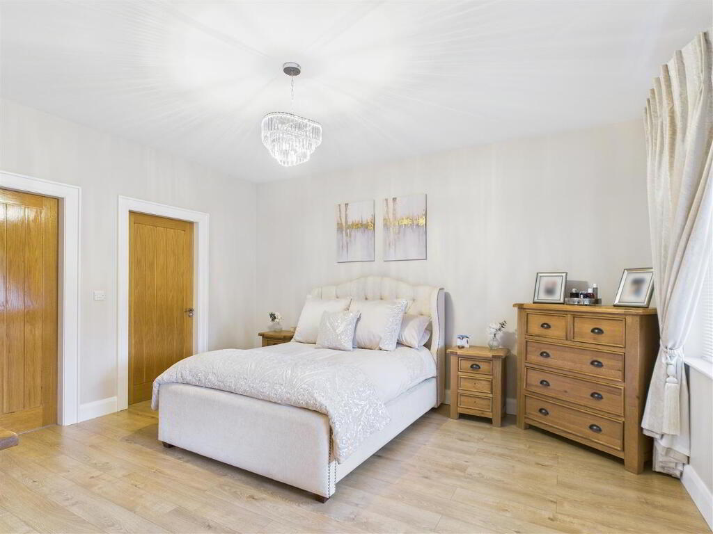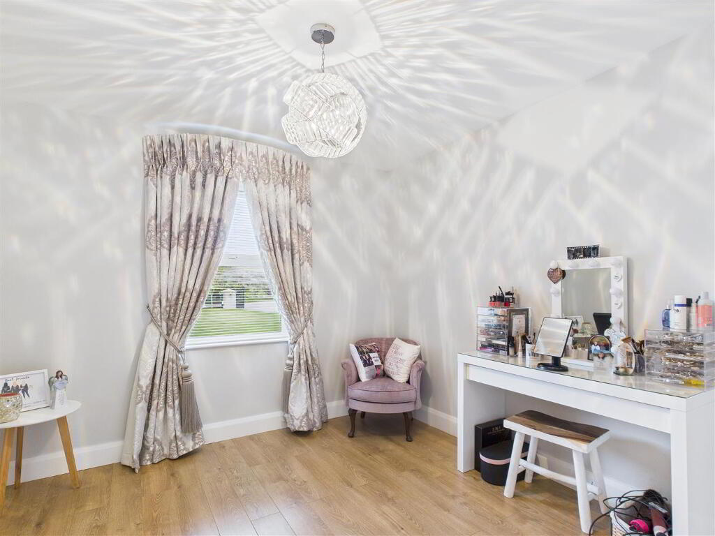 with t.v. point, walk-in dressing room (2.1m x 1.9m), wood effect laminate flooring. EN-SUITE: 2.0m x 1.9m having fully tiled corner shower cubicle with Thermostat shower, low flush w.c., wash hand basin with low level vanity unit, extractor fan, feature heated towel rail, recess low voltage down-lighters, part tiled walls, tiled flooring.