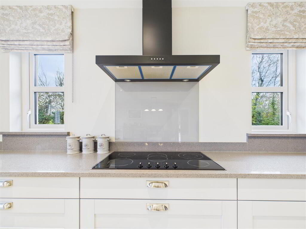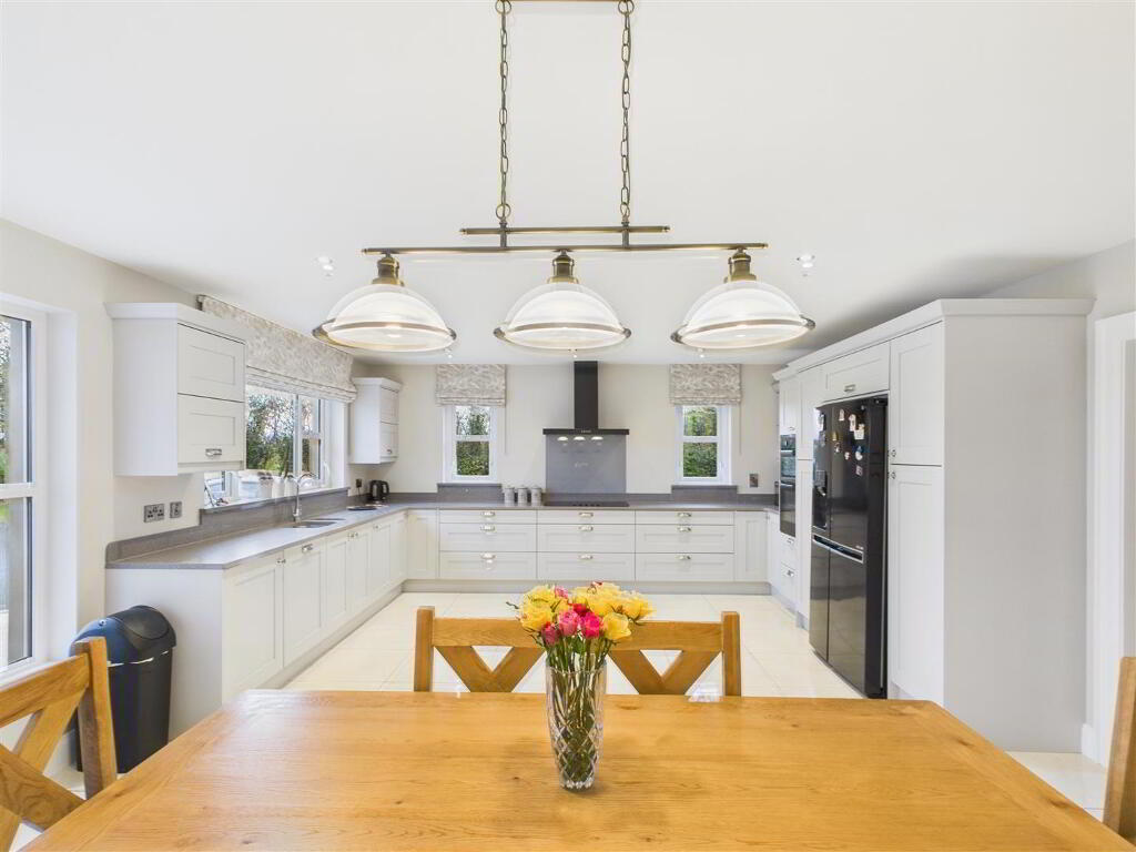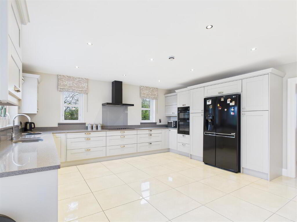 with a wide range of Grey painted eye and low level units (with soft closing doors), Quartz matching worktop with splash-backs, stainless steel sink unit, built-in double oven and ceramic hob, black extractor fan with light, plumbed for American fridge/freezer, integrated dishwasher, t.v. point, recessed low voltage down-lighters, feature corner window, Porcelain tiled flooring.