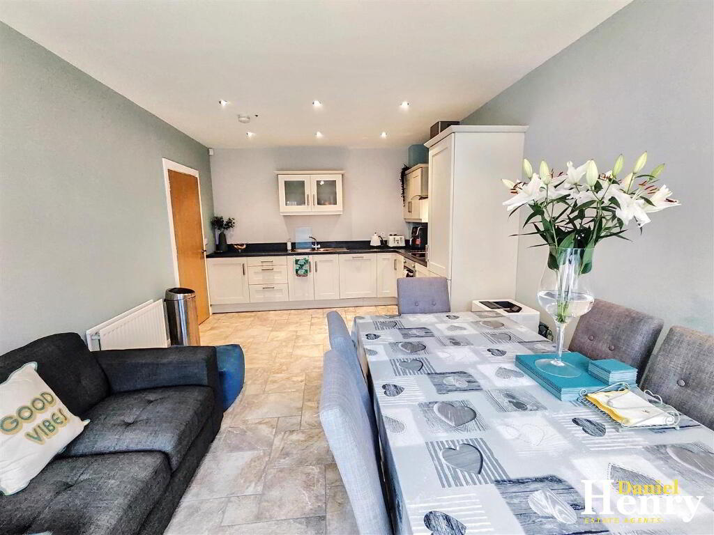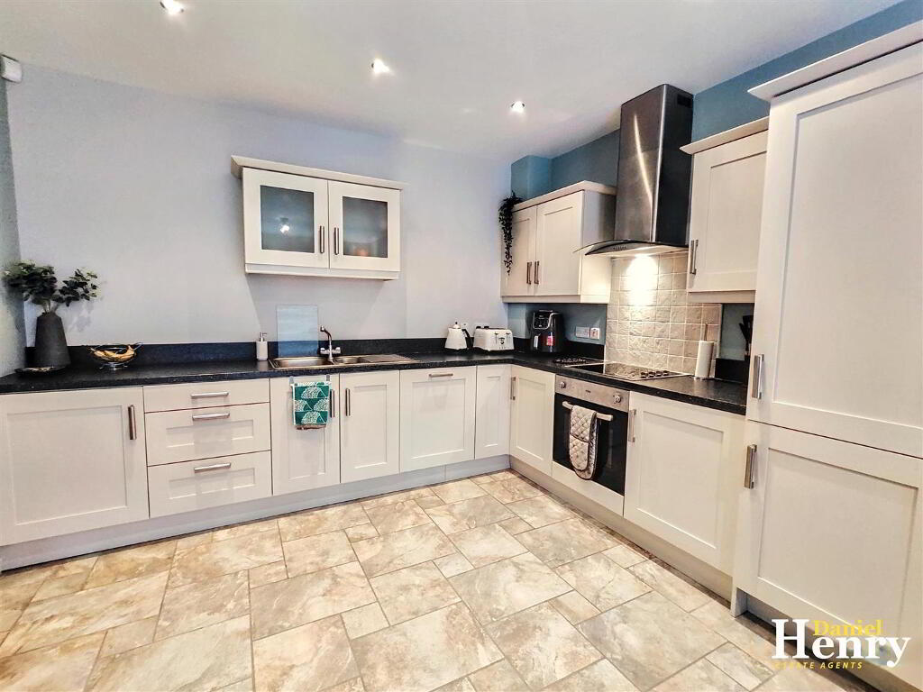 With fully fitted extensive range of eye and low level units with one and a half bowl stainless steel sink unit, integrated hob and oven with extractor fan, integrated fridge freezer, integrated dishwasher, patio doors to rear and tiled floor.