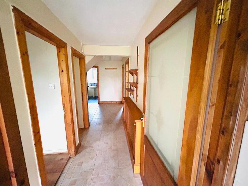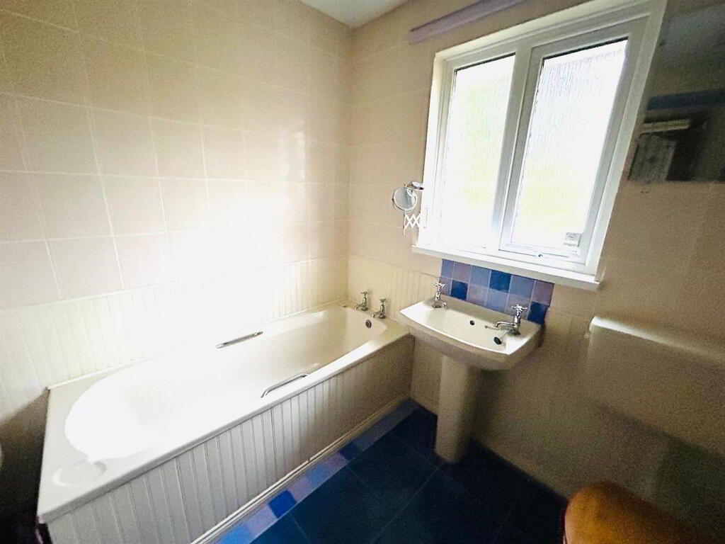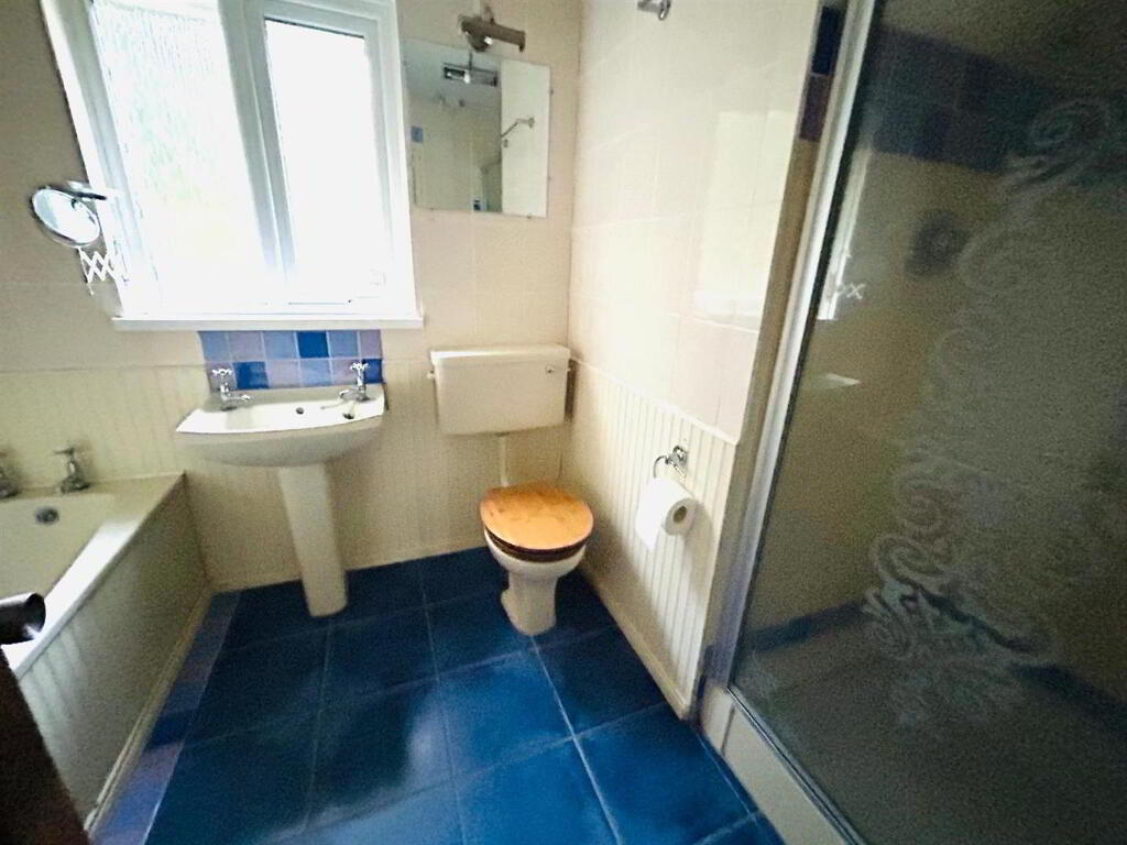 Comprising bath with tiling around, whb with tiling around, wc, fully tiled walk in electric shower, 1/2 height wooden panelled and 1/2 tiled walls, tiled floor, glazed door to hallway.