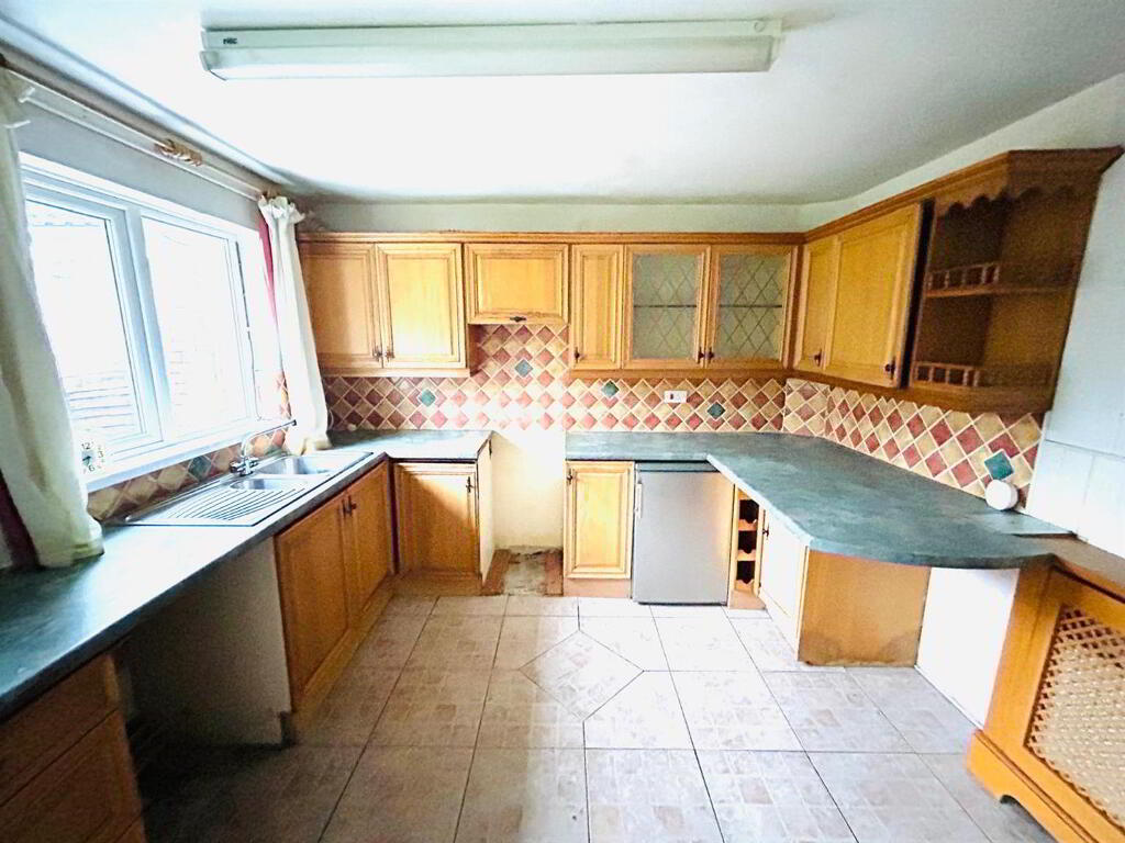 Having eye and low level units, tiling between units, 1 1/2 bowl stainless steel sink unit with mixer taps, space for cooker, extractor hood, plumbed for washing machine, space for fridge, glazed door to hallway, tiled floor.