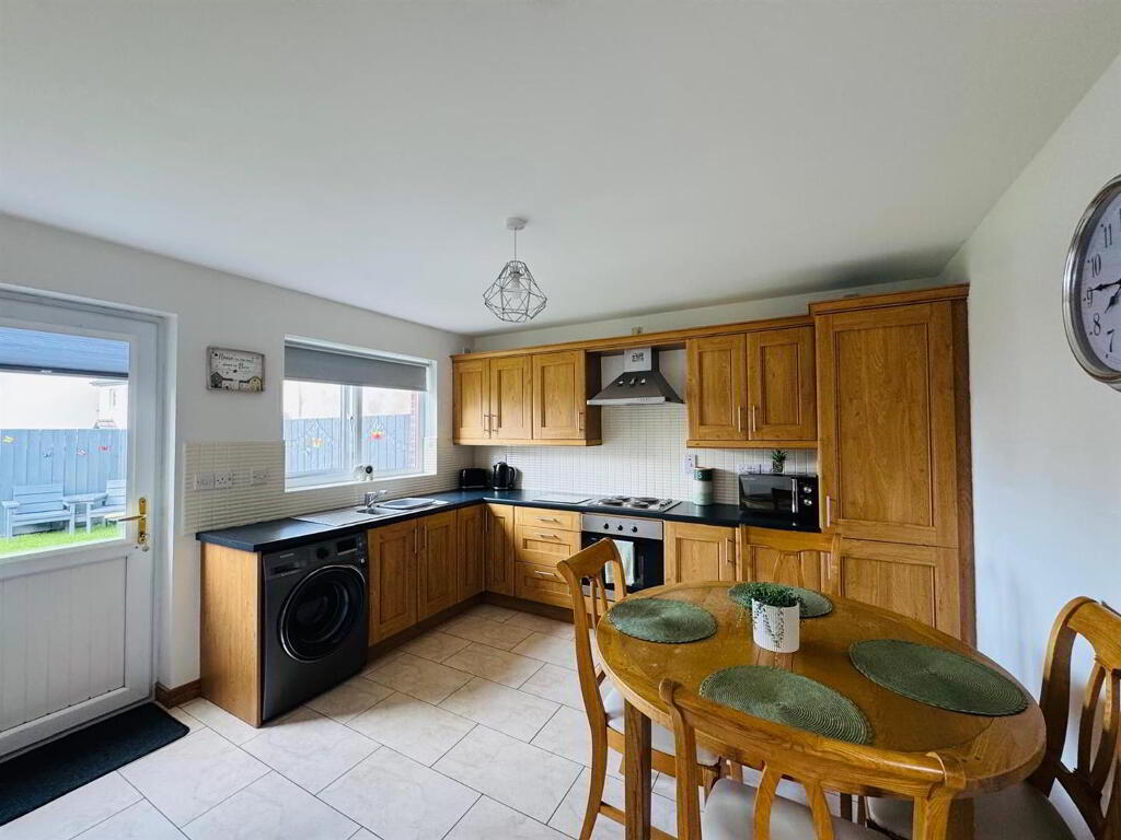 Having range of eye and low level units, tiling between units, 1 1/2 bowl stainless stell sink unit with mixer taps, hob, underoven, stainless steel extractor hood, plumbed for washing machine, integrated fridge / freezer, tiled floor. Ample dining space.