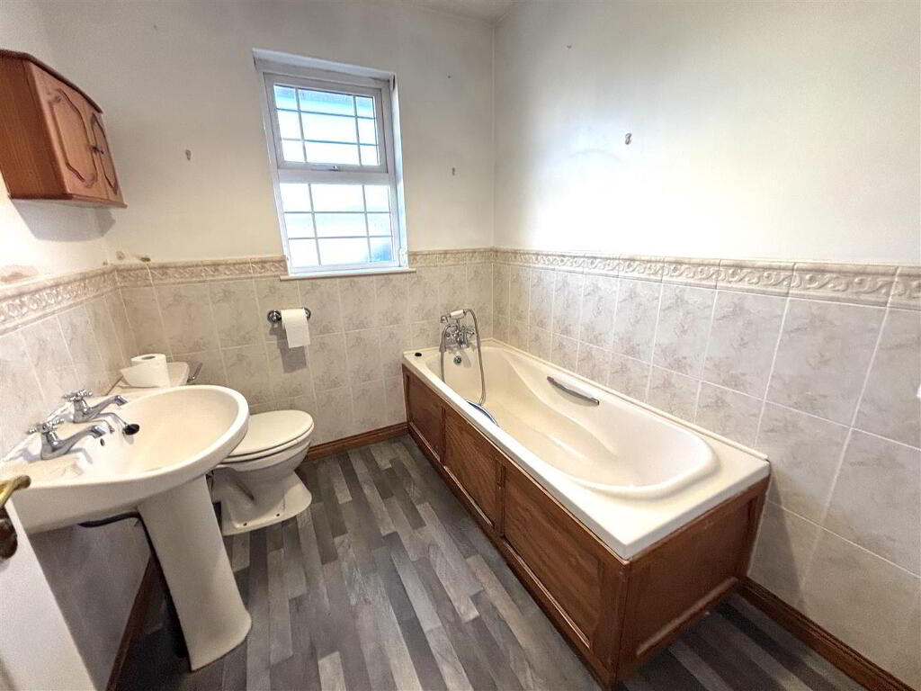 Consisting of a white bath with shower attachment over bath, pedestal wash hand basin and Low Flush W.C. Extractor fan. Tiled flooring.