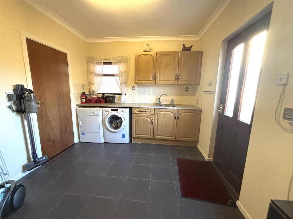 With a range of eye and low level units with matching worktop. Stainless steel sink unit. Tiled around units. Plumbed for automatic washing machine. Tiled flooring.