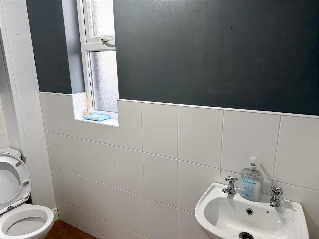 Low Flush W.C. Pedestal wash hand basin. Extractor fan. Laminate floor. Part tiled walls.
