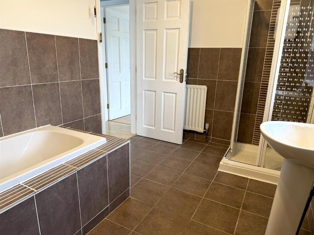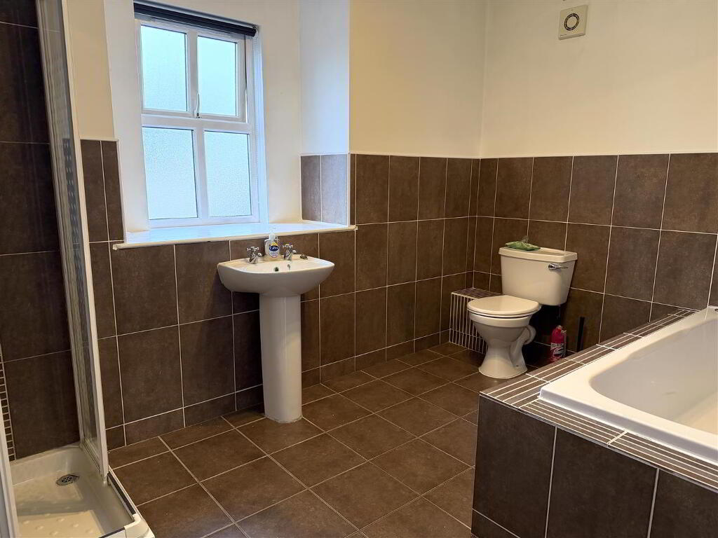 Fully tiled shower cubicle with electric shower. Low Flush W.C. Pedestal wash hand basin. Extractor fan. Tiled flooring.