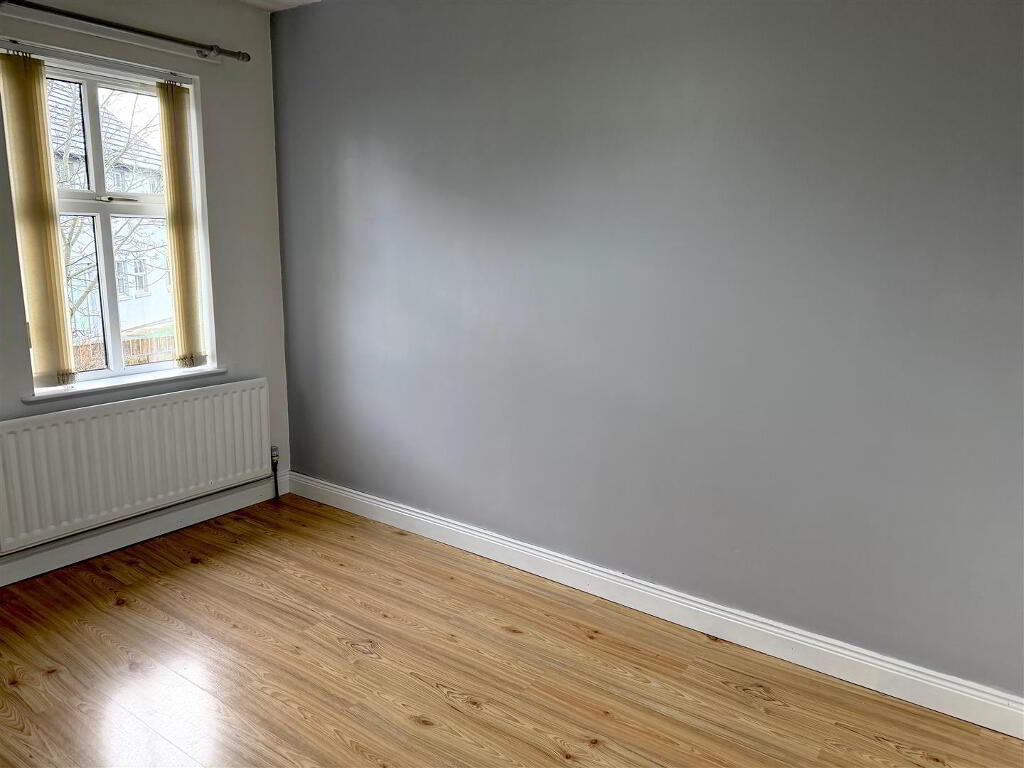 Wooden fireplace with cast iron inset and tiled hearth. Laminate flooring. Box window.