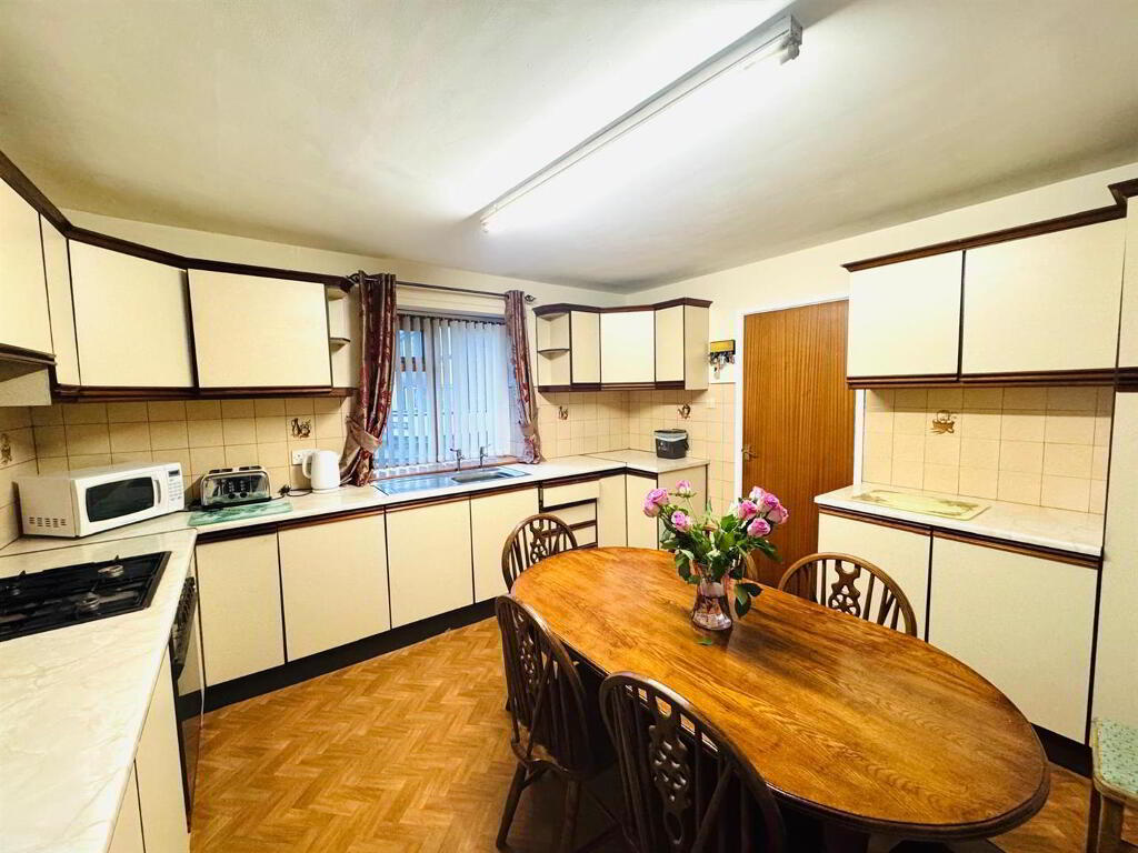 Having eye and low level units, tiling between units, single drainer stainless steel sink unit, gas hob, electric oven, dining space