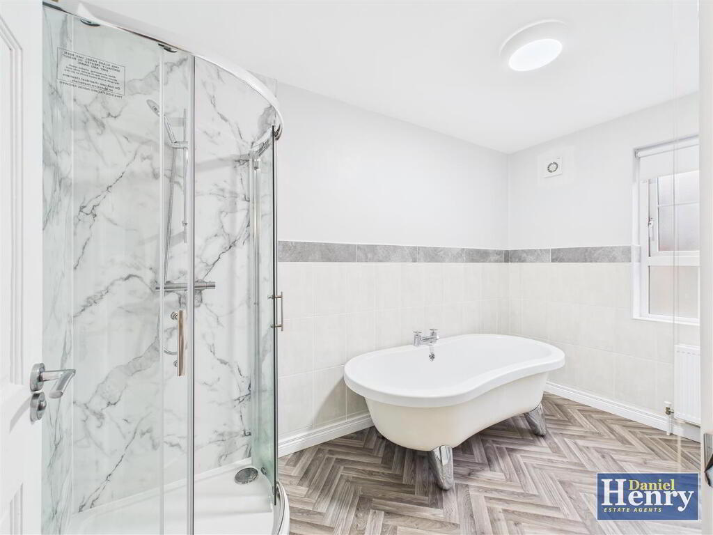 with four piece suite comprising of free-standing bath, pedestal wash hand basin, low flush w.c., uPVC panelled shower cubicle with thermostatic shower. Also having extractor fan, part tiled walls, cushion flooring.