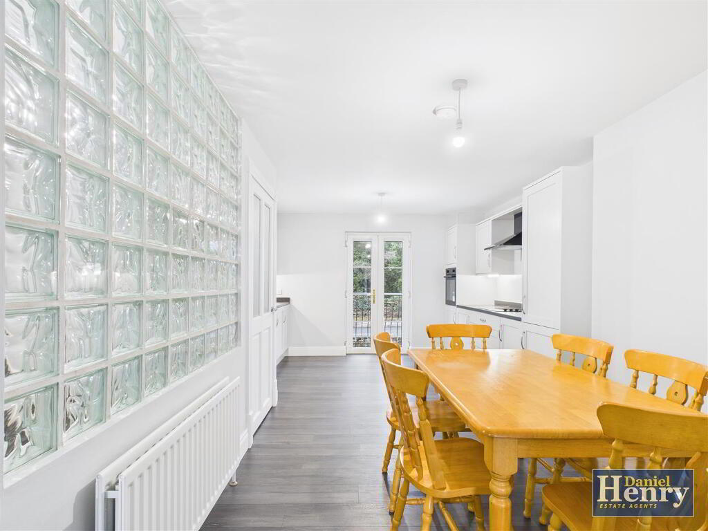 with a range of grey painted eye and low level units, matching worktop with up-stand, under-unit lighting, stainless steel sink unit, pelmet with recess lighting, built in hob and oven, extractor fan with light, built-in fridge/freezer, wood effect laminate flooring, uPVC patio doors.