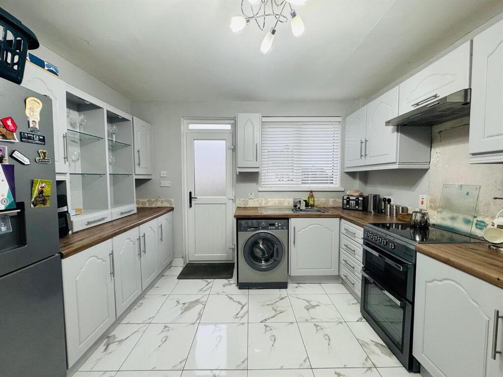 Having eye and low level units, single drainer stainless steel sink unit with mixer taps, open display shelves, extractor hood, plumbed for washing machine, space for tumble dryer, space for fridge/freezer, tiled floor.