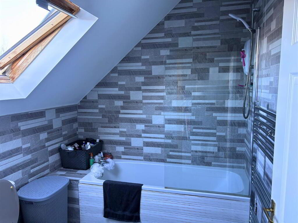 with three piece suite comprising of fitted bath with electric shower overhead, pedestal wash hand basin, low flush w.c. Also having extractor fan, stainless steel room heater, Velux window, fully tiled walls, tiled flooring.