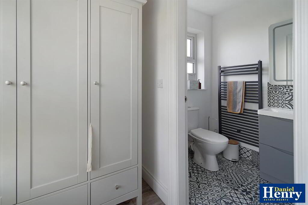 Comprising fully tiled walk in shower, whb with storage under, wc, black radiator, tiled floor.