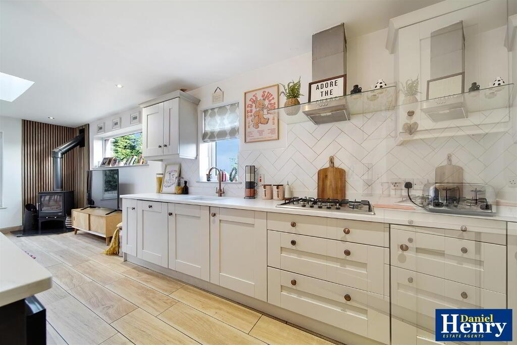 Having range of eye and low level units, 1 1/2 bowl sink unit set in Quartz worktop, 5 ring gas hob, stainless steel extractor hood, double oven, space for American style fridge/freezer, integrated dishwasher, centre island with breakfast bar and storage under, dining area having sliding patio doors, living area having multi fuel stove, recessed lighting, tiled floor.