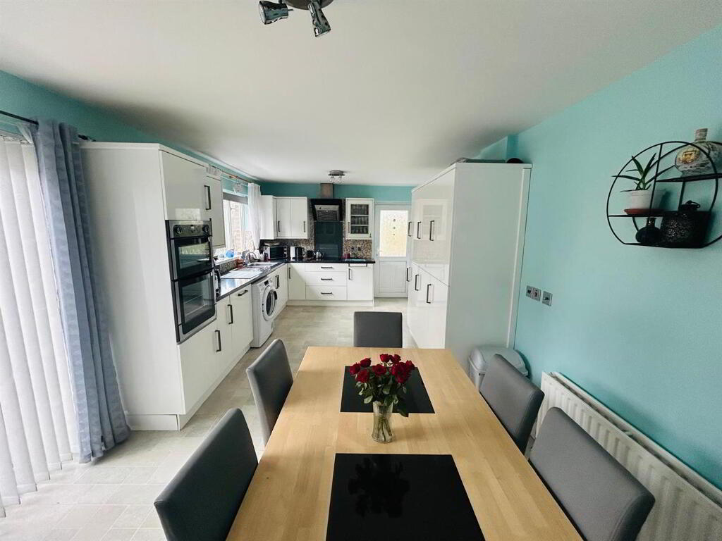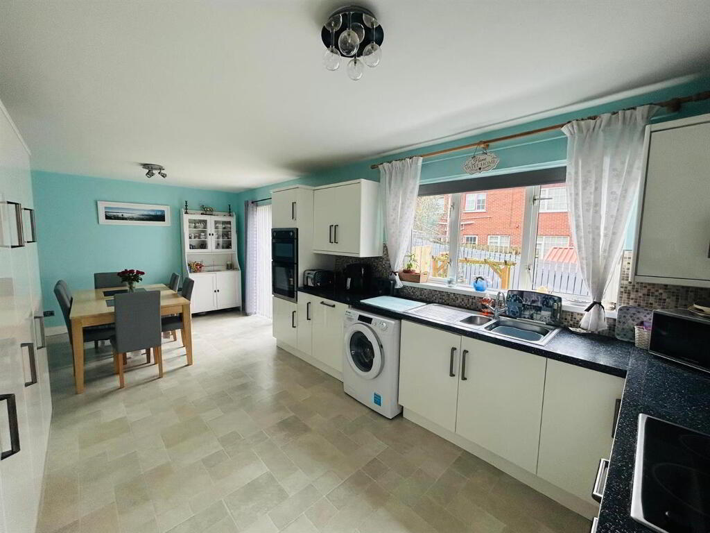 Having excellent range of eye and low level units, 1 1/2 bowl stainless steel sink unit with mixer taps, hob, double oven, extractor good, integrated fridge/freezer and dishwasher, plumbed for washing machine, ample dining space with French doors to rear.