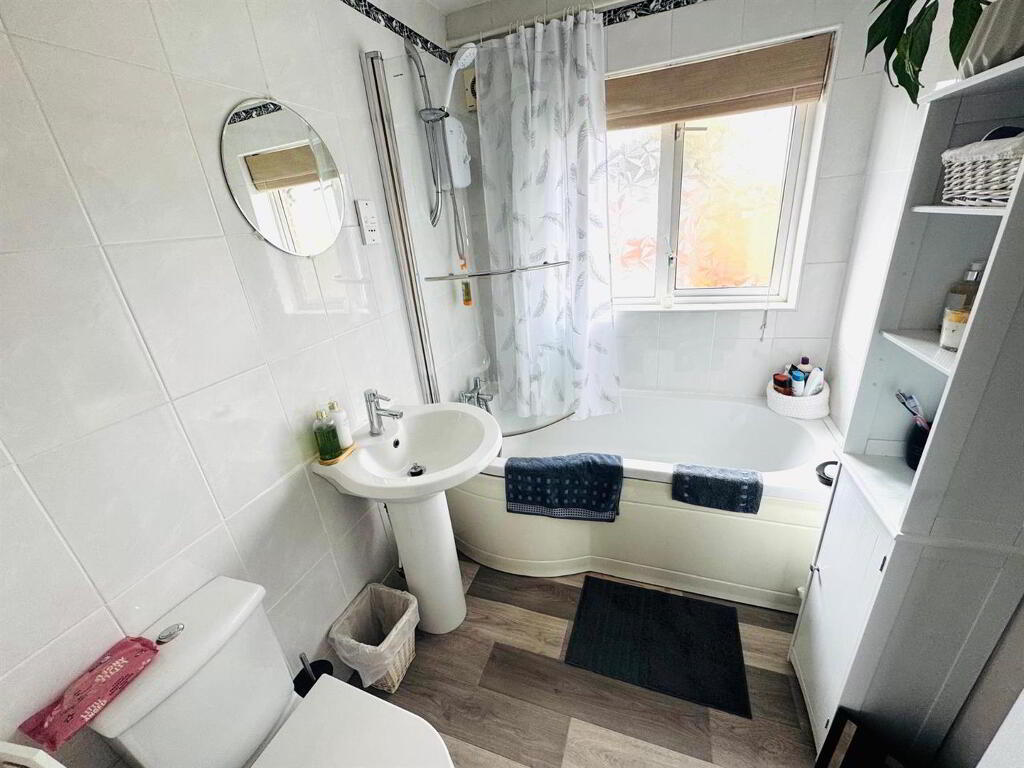 Comprising bath with electric shower over, shower screen, whb and wc, tiled walls.