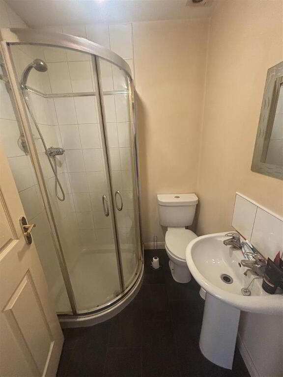 with three piece suite comprising of fitted bath with electric shower over-head and shower screen, pedestal wash hand basin, low flush w.c. Also having extractor fan, tiled around bath, tiled floor.