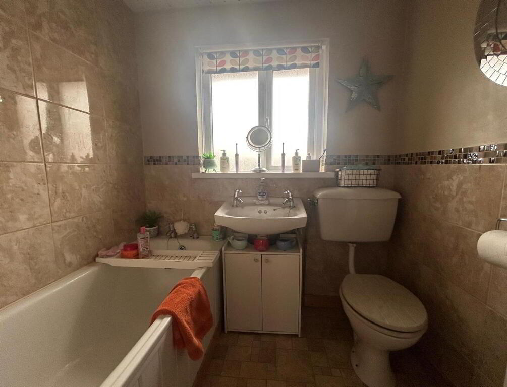Comprising bath with electric shower over, shower screen, whb and wc, PVC ceiling, partly tiled walls.