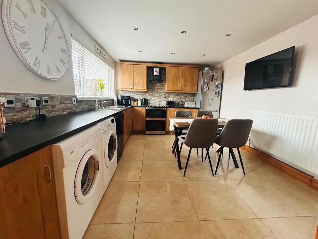 Having eye and low level units with concealed lighting under, tiling between units, single drainer stainless steel sink unit with mixer taps, wired for cooker, extractor fan, plumbed for dishwasher and washing machine, space for fridge/freezer, vented for tumble dryer, recessed lighting, tiled floor.