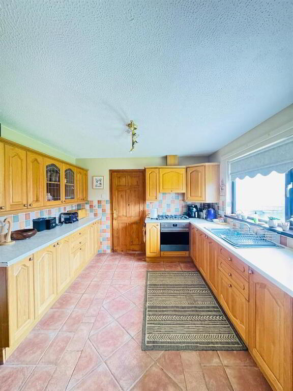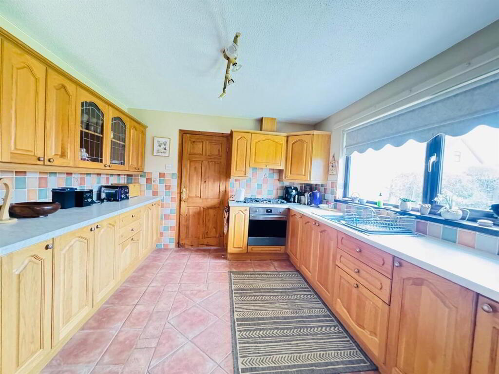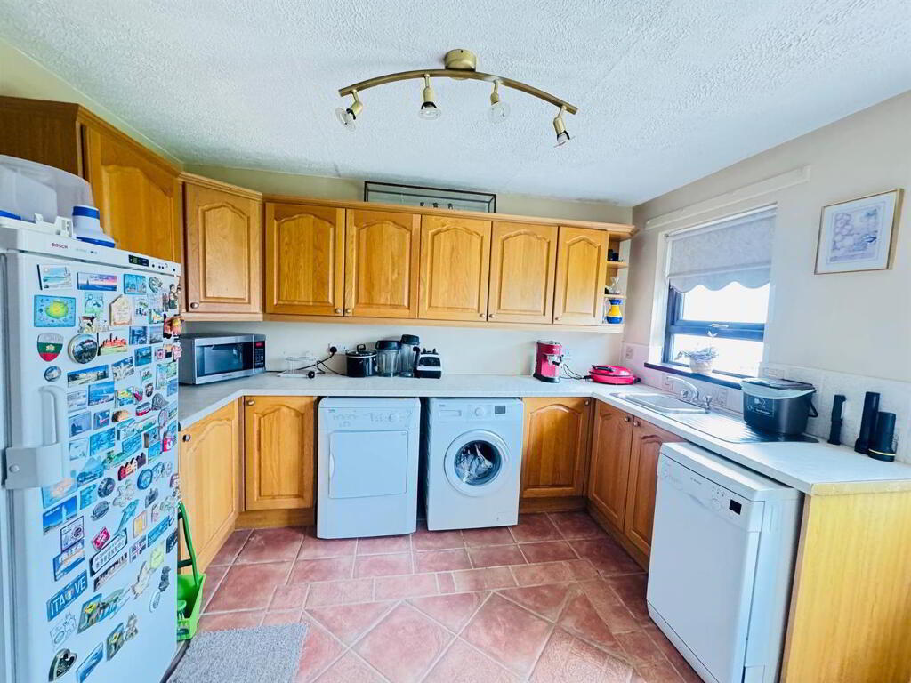 Having range of eye and low level units, single drainer stainless steel sink unit with mixer taps, plumbed for washing machine and dishwasher, space for tumble dryer, tiled floor.