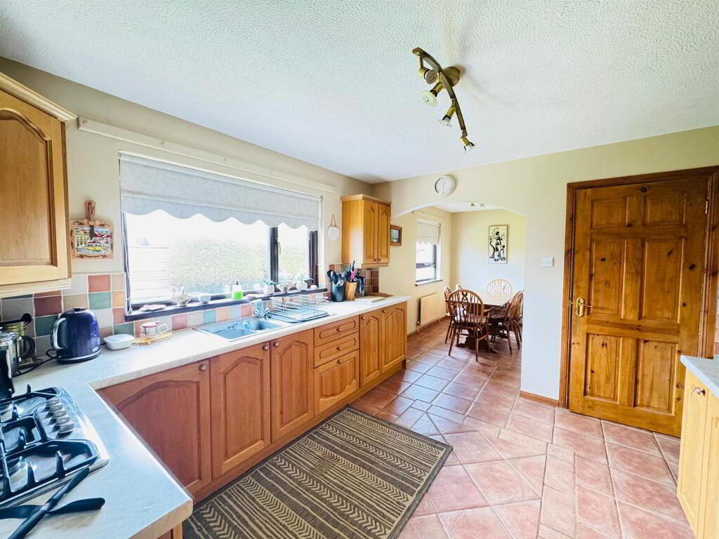 Having range of eye and low level units, tiling between units, gas hob, electric underoven, extractor hood, integrated fridge, ample dining space, tiled floor.