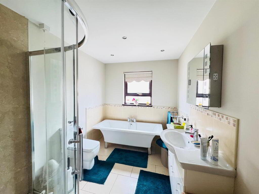 Comprising bath, walk in shower, whb with storage under, wc, recessed lighting partly tiled walls, tiled floor.