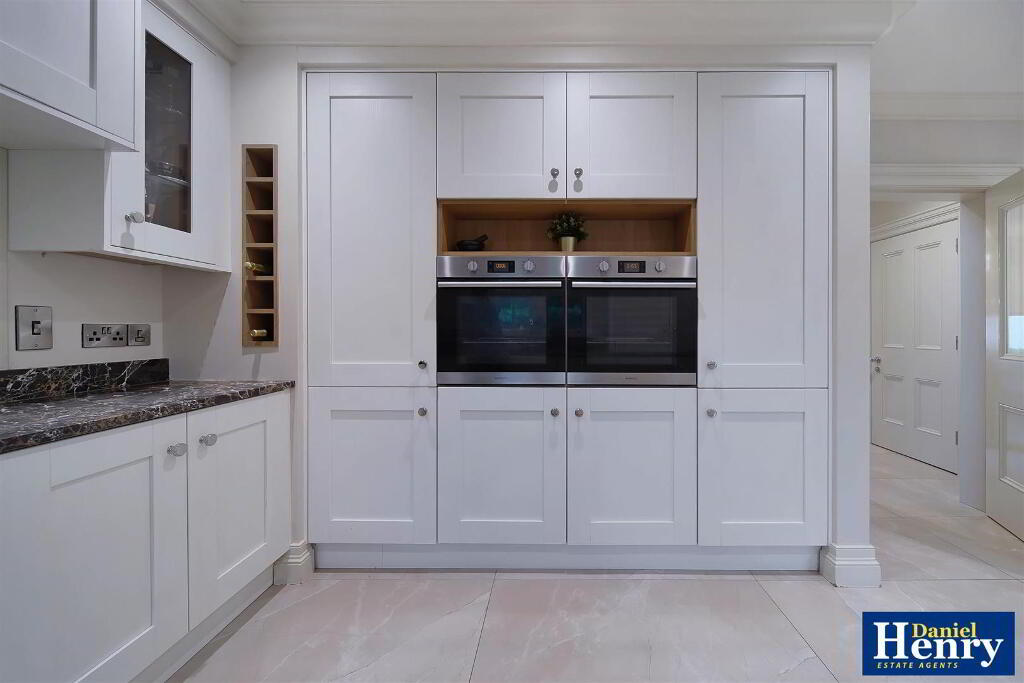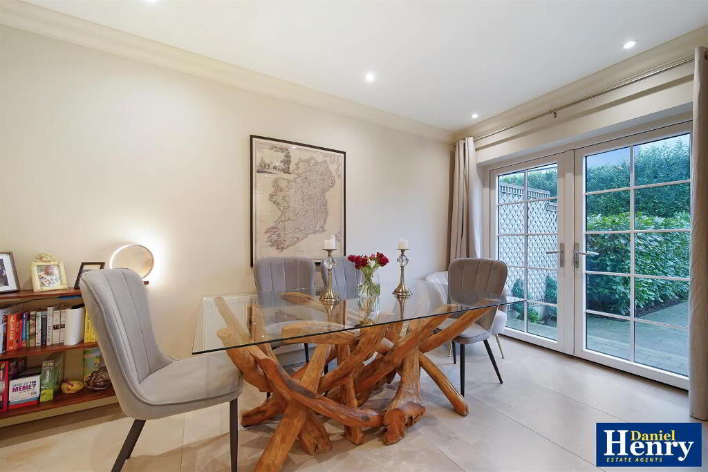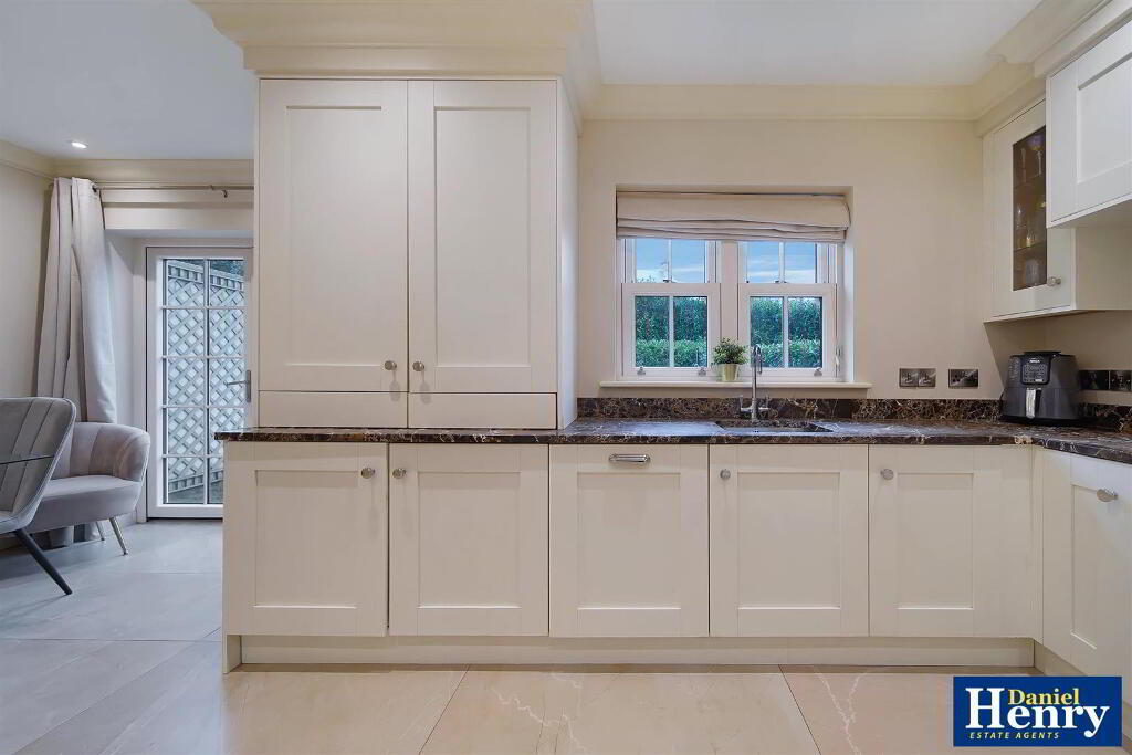 Having range of eye and low level units, stainless steel sink unit with mixer taps set in granite worktop with matching splashback, twin ovens, hob, extractor hood, integrated dishwasher and fridge/freezer, feature skirting lighting, recessed lighting, ceiling cornicing, ample dining space, French doors to rear.