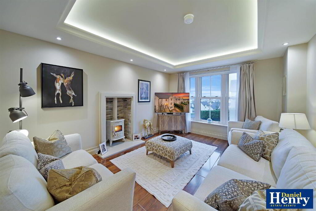 Having multi fuel stove set on 'Quartz' hearth, feature drop ceiling with concealed lighting, laminated wooden floor.